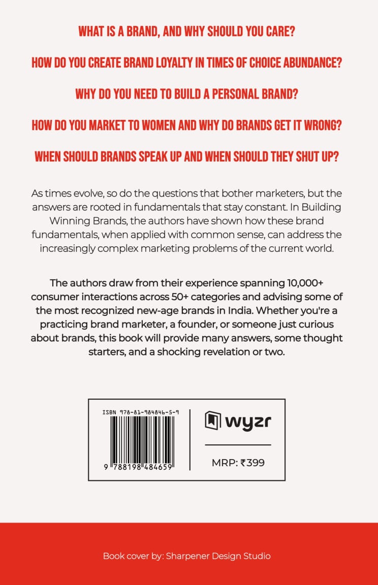 The authors draw from their experience spanning 10,000+ consumer interactions across 50+ categories and advising some of the most recognized new-age brands in India. Whether you're a practicing brand marketer, a founder, or just curious about brands, this book will provide many answers, some thought starters, and a few shocking revelations.