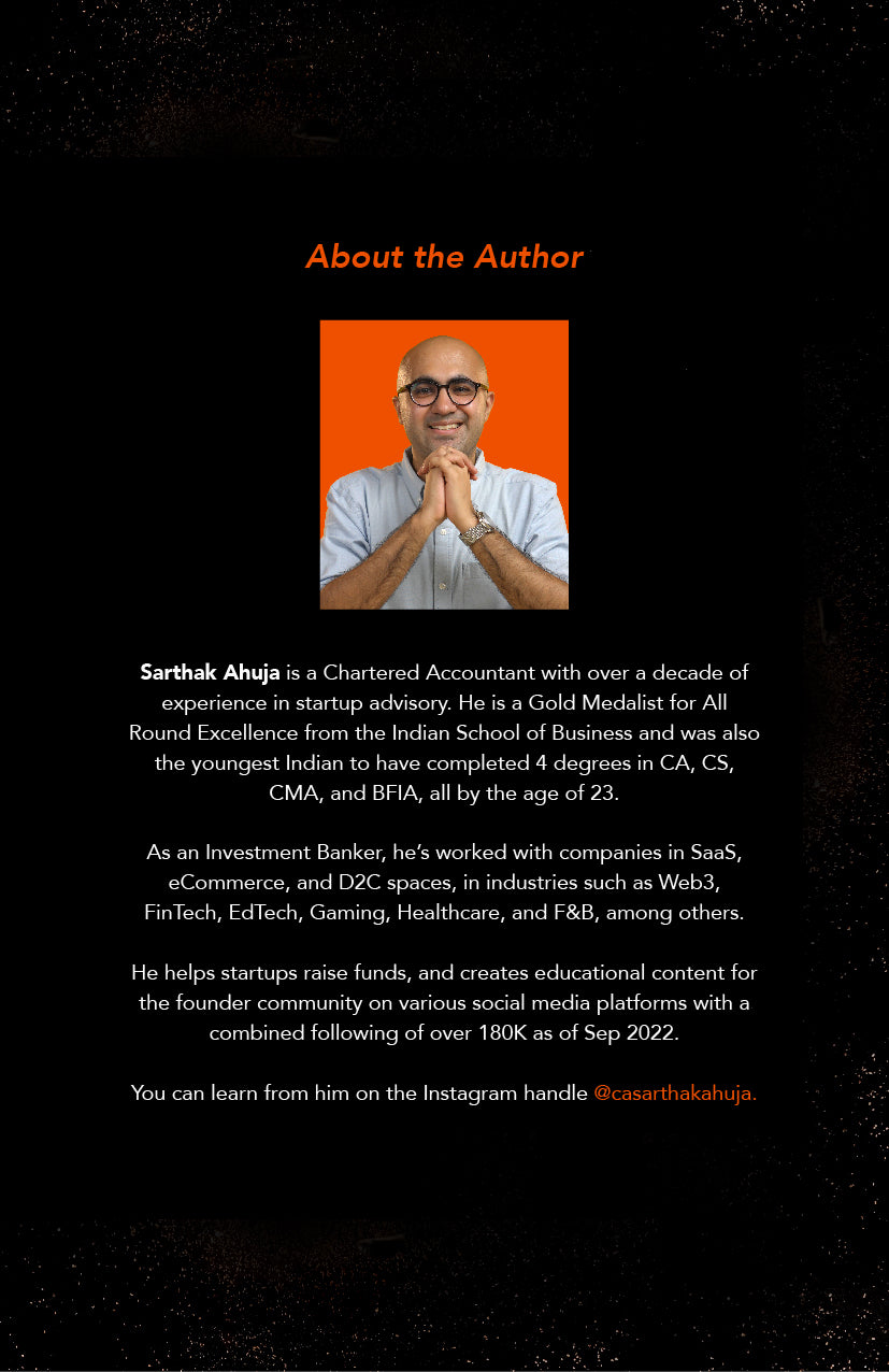 Sarthak Ahuja operates from the unique vantage point of an Investment Banker helping startups raise capital, a Chartered Accountant helping them get their finances and compliances in order, and as a business advisor helping them kick off right. Working in proximity to both founders and investors, he understands intimately where founders struggle and how investors perceive new businesses. He brings both these perspectives masterfully in this book.