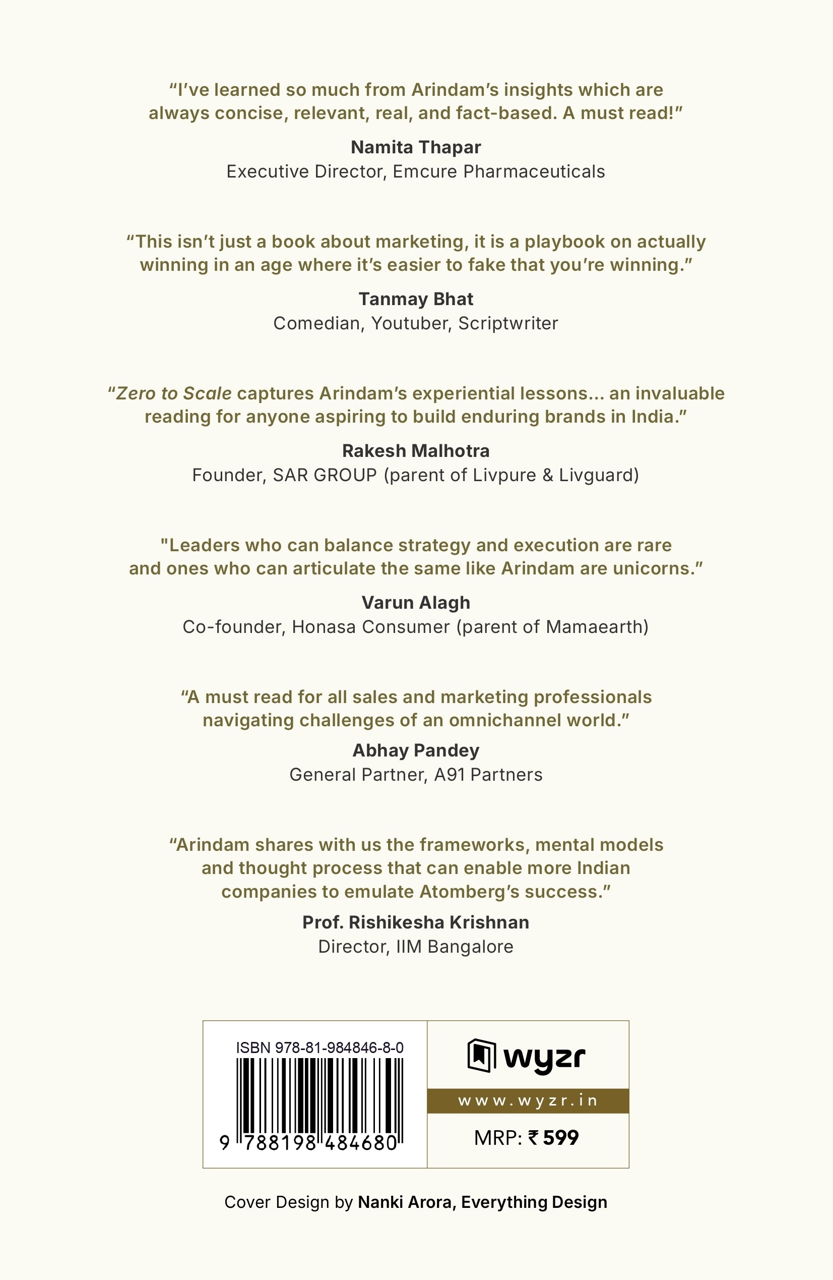 In Zero To Scale, Arindam Paul has meticulously documented all his learnings across every function brand operators need to master — product, distribution, acquisition, brand building, organization, and more. It’s a rare, original playbook drawn from the hard-won experience of scaling Atomberg from a pre-revenue upstart to over 1000 Cr in annual revenue. For anyone building a brand in India or pursuing a career in sales and marketing, this book offers practical, actionable insights you can’t afford to miss.